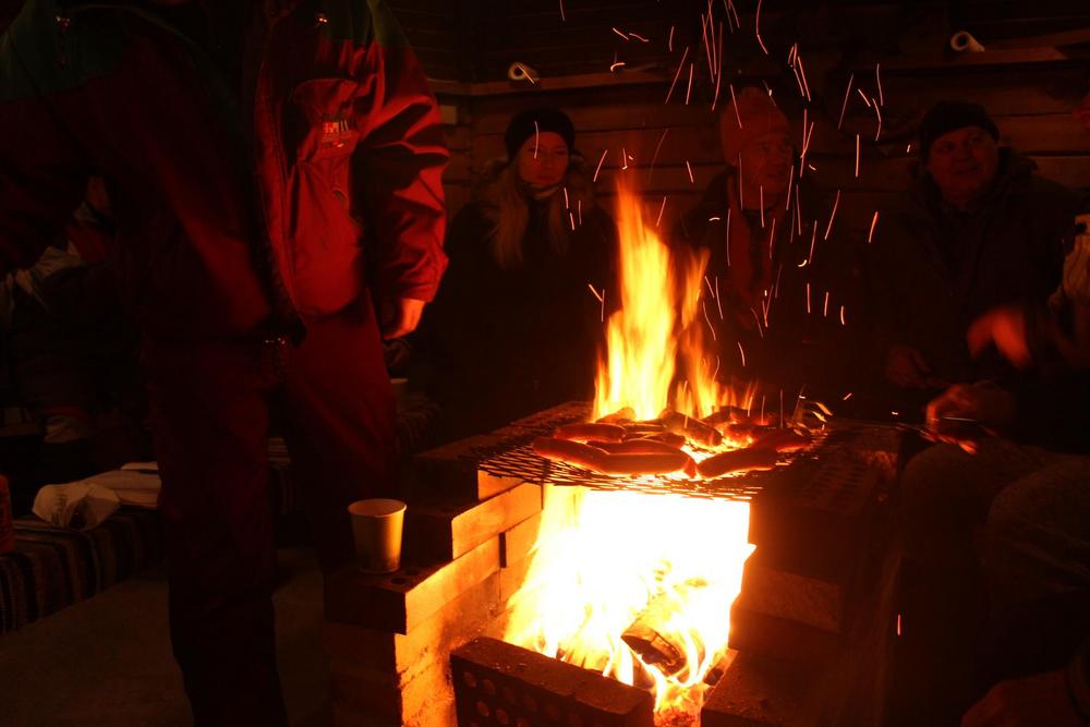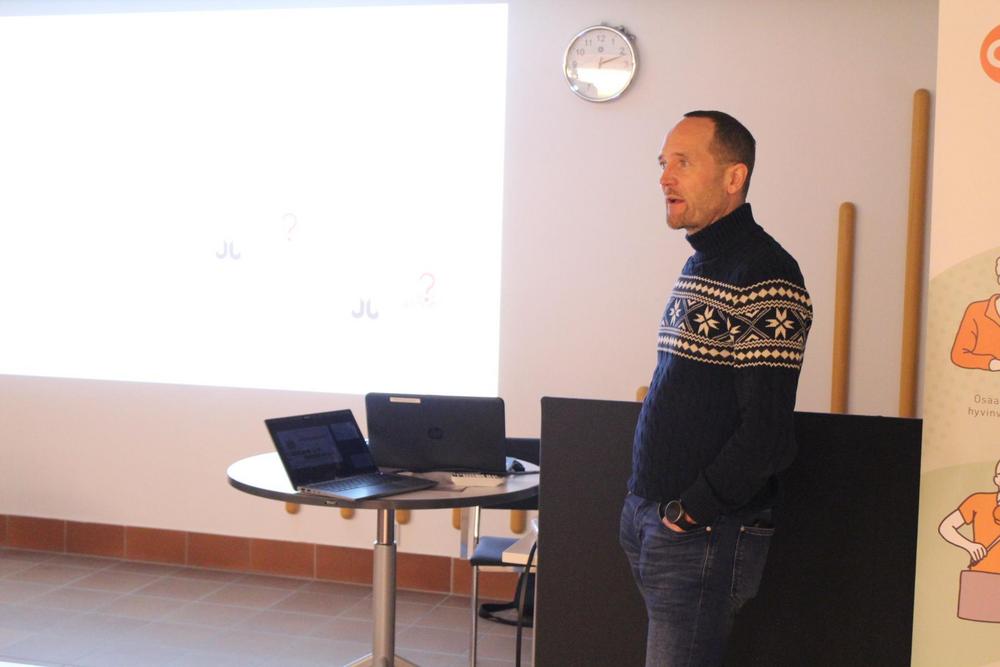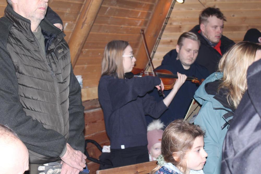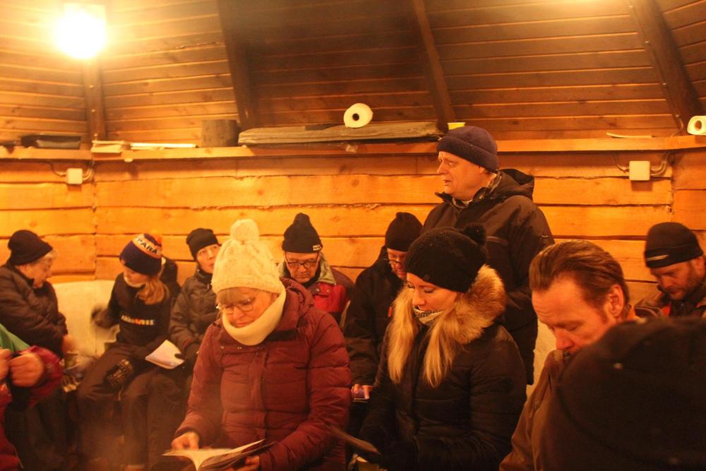 Vt. kirkkoherra Jukka Taskinen laulatti ja säesti kauniimpien joululaulujen laulamista sähköuruilla, joka hieman oikutteli kodan lämmöstä johtuen.
