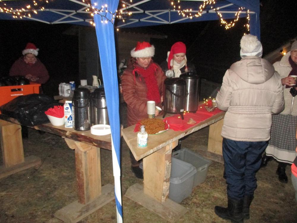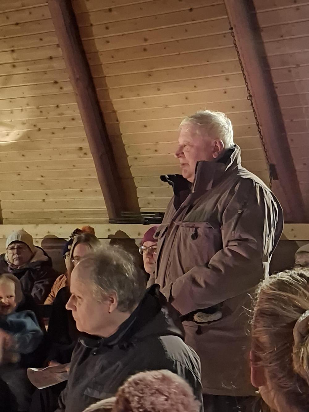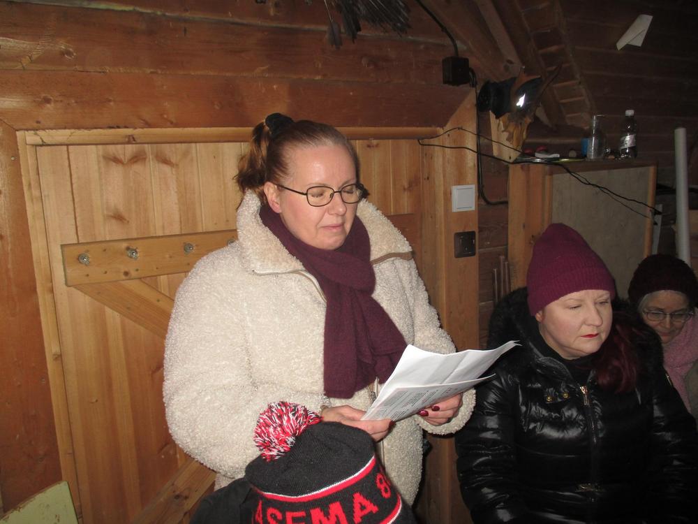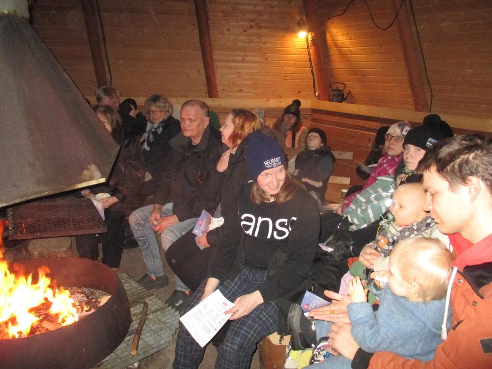 Vt. kirkkoherra Jukka Taskinen laulatti ja säesti kauniimpien joululaulujen laulamista sähköuruilla, joka hieman oikutteli kodan lämmöstä johtuen.
