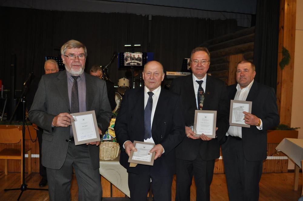 Riistakeskuksen hopeisen ansiomerkin sai Esko Niininen (vasemmalla), pronssisen ansiomerkin saivat Tapani Mäenpää, Veikko Rouhiainen ja Raimo Ukkonen.